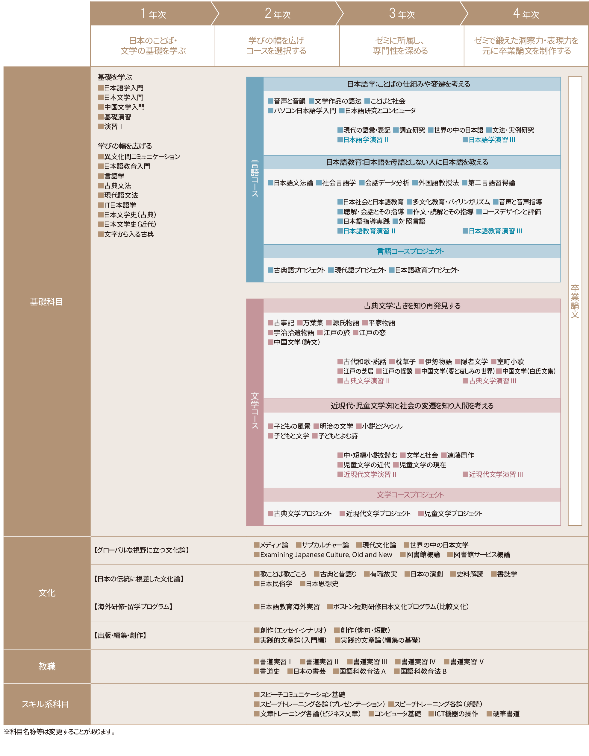 日本の言語文化について1年次は基礎を中心に学び、2年次は学びの幅を広げながらコースを選択します。言語コースは、ことばの仕組みや変遷を学ぶ「日本語学」、日本語を母語としない人に日本語を教える「日本語教育」、文学コースは、「古典文学」「近現代文学」に分かれます。3年次からゼミに所属し、専門性を深めます。また、歴史や思想、民俗学などで日本古来の文化を学びます。さらにメディアやサブカルチャー、また異文化間コミュニケーションなどの科目によりグローバルな視点も養います。日本の言語文化の変わらないものと変わり続けるものを学び、物事の本質を見極める力をつけます。さらにプロジェクト活動を通して、社会で求められる課題解決能力も身につけます。