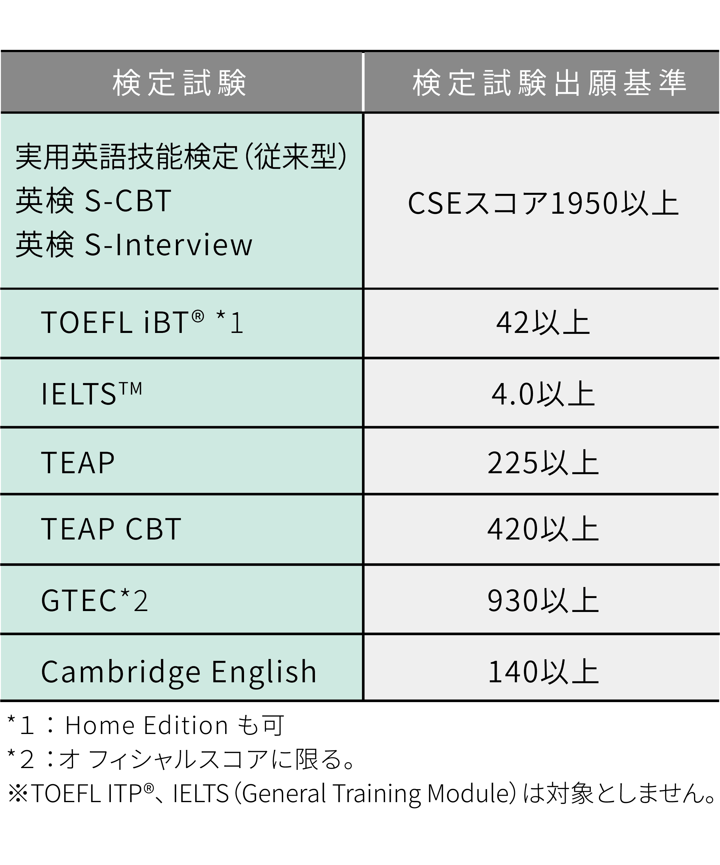 英語検定試験の「出願基準」を満たし、各学科の指定した大学入学共通テストの成績から上位1科目を採用して選考します。独自試験はありません。